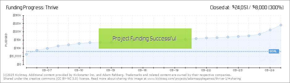 Funded! When we launched the project, I didn't imagine that Thrive would be funded in just over 24 hours. I knew the game was compelling, and the artwork was eye-catching. Yet I continue to be amazed by the amount of support to make this game a... (Read More)