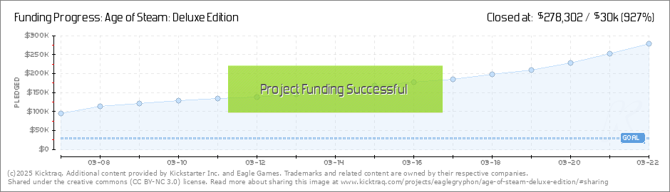 Thanks for your terrific support for Age of Steam Deluxe. Now that we are fully funded to produce the game we want to assure you that you will be very happy with and proud to own the production we have planned for you. We have spent lots of time... (Read More)